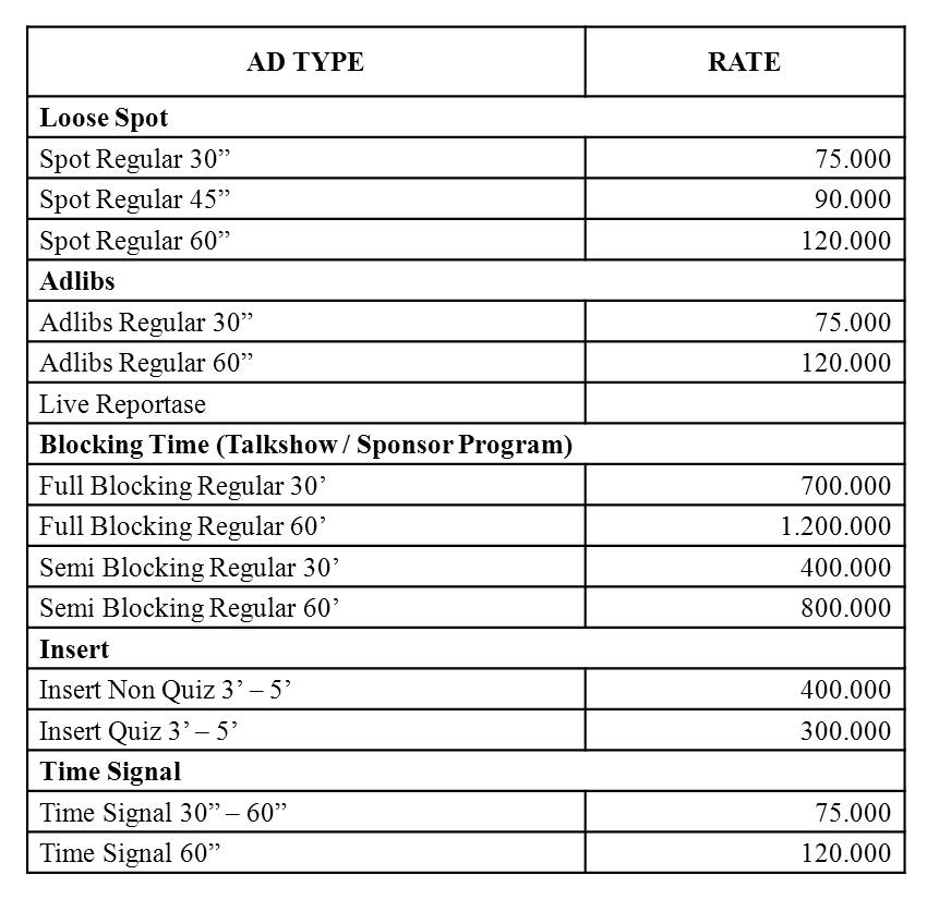 Rate Card 2014 Untuk informasi dan kerjasama lebih lanjut silahkan menghubungi kami. 2013-05-15 +R-lisa FM Bagikan Facebook Twitter Google + LinkedIn Pinterest